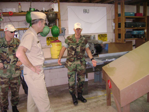 At the request of the Society, CAT 04-29 (Air Force) Master Senior Chief Alex Gray received funding from the NMCB Four, Chief Petty Officers Association for construction of display cases for the Peleliu War Museum. In the photo here, the completed cases are being viewed by Rear Admiral William French before transport to Peleliu.